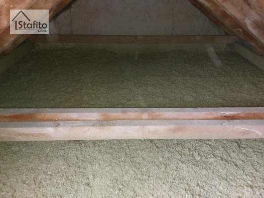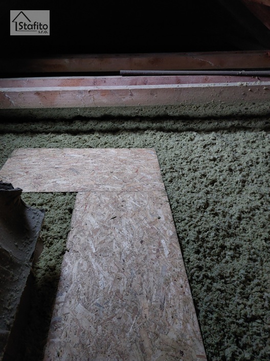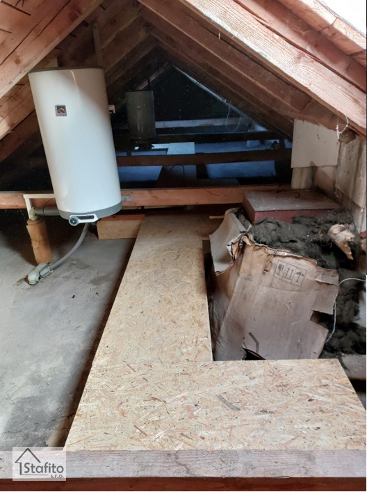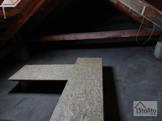 Obálka bytového domu a okna byla již vyměněná. Zbývalo zateplit půdu. To se nedá pokud je plná letitých "pokladů". Za den vyklízení bylo možno začít! Nejprve s lávky pro kominíky a instalatéry a pak už samotné zateplení.